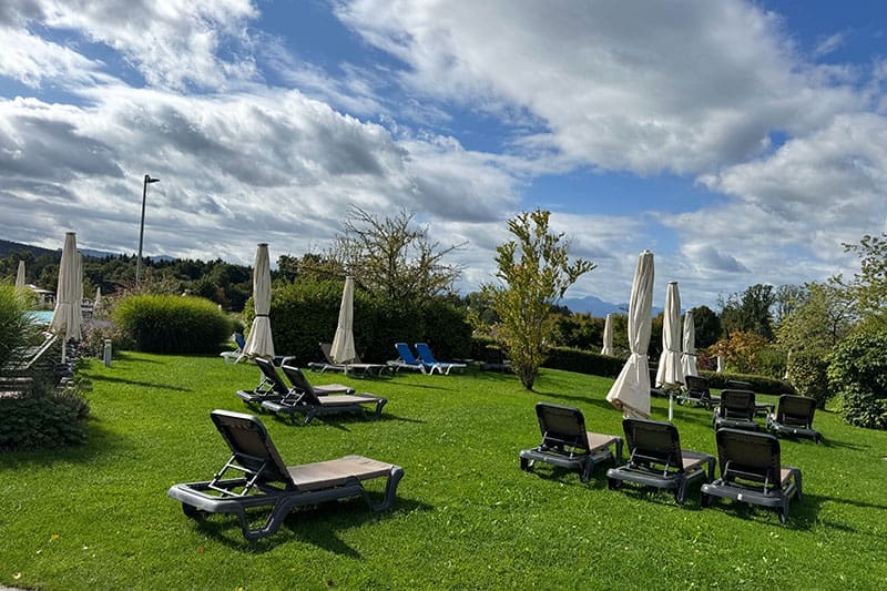 - Die entspannte Stimmung post-Sauna, draußen auf der Liegewiese, mit Blick auf Wasser und Bäume – wie eine kleine Meditation mitten im Alltag.