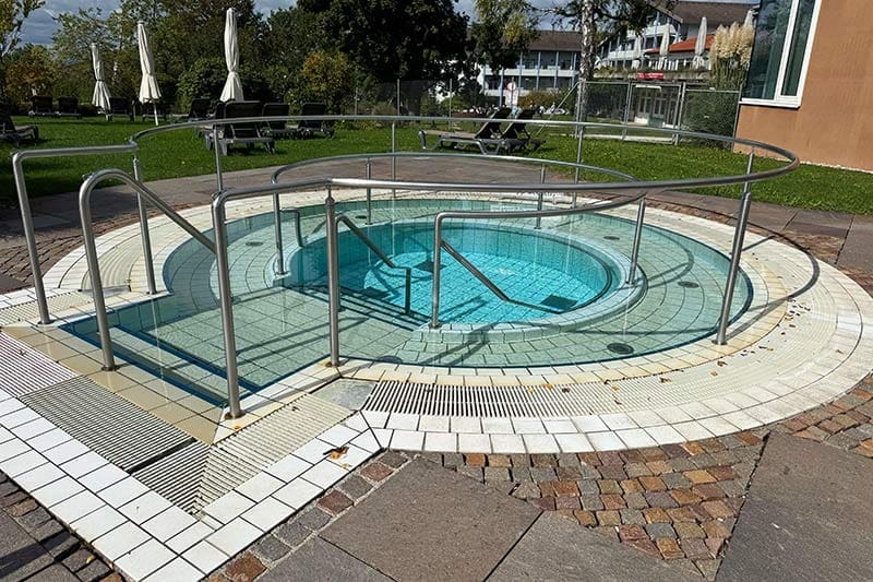 Die Gestaltung der Thermenlandschaft ist top durchdacht: drinnen und draußen, Licht und Wasser, Panorama und Grünblicke – alles so arrangiert, dass man schon beim Sitzen das Gefühl hat, man könnte Stunden hier verbringen. Schon die Wasserfläche, die abwechselnd laut-oder-leise Becken, Außenpools und die Panorama‐Liegewiese bietet, lädt direkt zur ersten Pause ein.