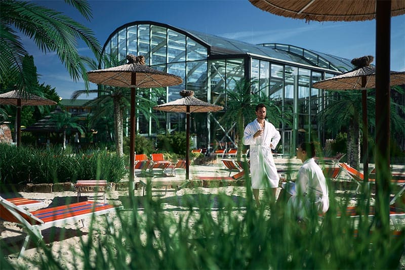 Und da kam sie, die Oase der Ruhe: die Cabrio-Therme Tropicana. Wenn das Dach aufgeht und die Sonne hereinstrahlt, fühlt man sich wirklich wie in einer anderen Welt.