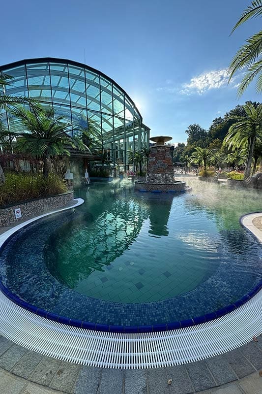 Und da kam sie, die Oase der Ruhe: die Cabrio-Therme Tropicana. Wenn das Dach aufgeht und die Sonne hereinstrahlt, fühlt man sich wirklich wie in einer anderen Welt.
