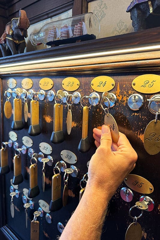 - Der Zimmerschlüssel wird beim Verlassen des Hotels in das Holzbrett gesteckt, so erhält man automatisch den Hausschlüssel zum Mitnehmen.