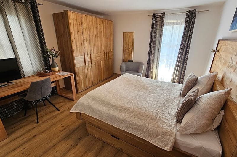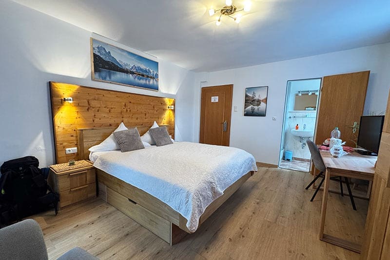 Wir bezogen ein Zimmer, das uns sehr gut gefiel: Viele Holzkomponenten – Böden, Möblierung, Details – ließen eine warme, natürliche Stimmung entstehen. Der Stil wirkte bewusst bayerisch angehaucht, aber nicht übertrieben kitschig – es fühlte sich heimelig an, als käme man in eine moderne Variante einer Berghütte.