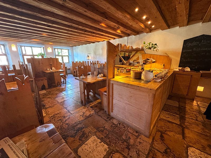 Morgens geht’s weiter mit dem Erlebnis: Der Frühstücksraum ist so holzlastig und warm, dass du dich direkt in eine alte Tafelrunde versetzt fühlst. Nur dass du statt Met und Wildschweinbraten ein frisches, leckeres Frühstücksbuffet bekommst, das keine Wünsche offenlässt. Von knusprigen Brötchen bis hin zu allem, was du für einen guten Start brauchst – und du musst nicht mal mit den Fingern essen.