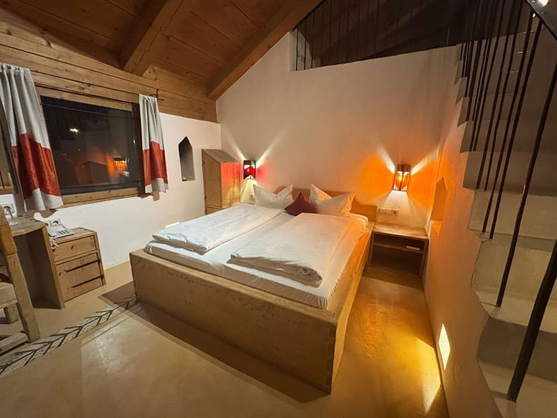Jedes der 38 Zimmer ist anders, und das meinen wir so. Mal schläfst man unter einem Kreuzgewölbe, mal in einem Wasserbett, mal wartet eine Whirlwanne auf den Gast, die so groß ist, dass man denkt, man bist im Mini-Spa. Manche Zimmer haben sogar einen Kachelofen oder eine kleine Dachterrasse. Unser Zimmer beinhaltete eine Treppe nach oben, wo unter dem Dach noch ein weiteres Bett wartete. Insgesamt war es ein sehr schöner und vor allem großer Raum mit einer hohen Decke. Das Bett war angenehm weich und es fehlte an nichts.