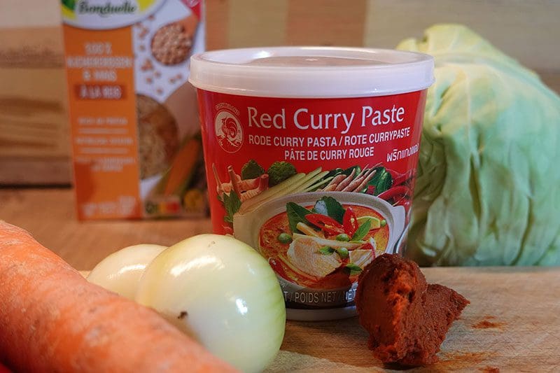 Perfekt ist, dass man das meiste schon zu Hause in der Küche oder der Vorratskammer parat hat. Gemüse, Kokosmilch, Zwiebeln, Knoblauch, Currypaste oder Gewürze und einen guten Reis. Dazu gerne noch ein Kokosöl und eventuell eine Zitrone oder Limette, je nachdem was man gerade da hat.