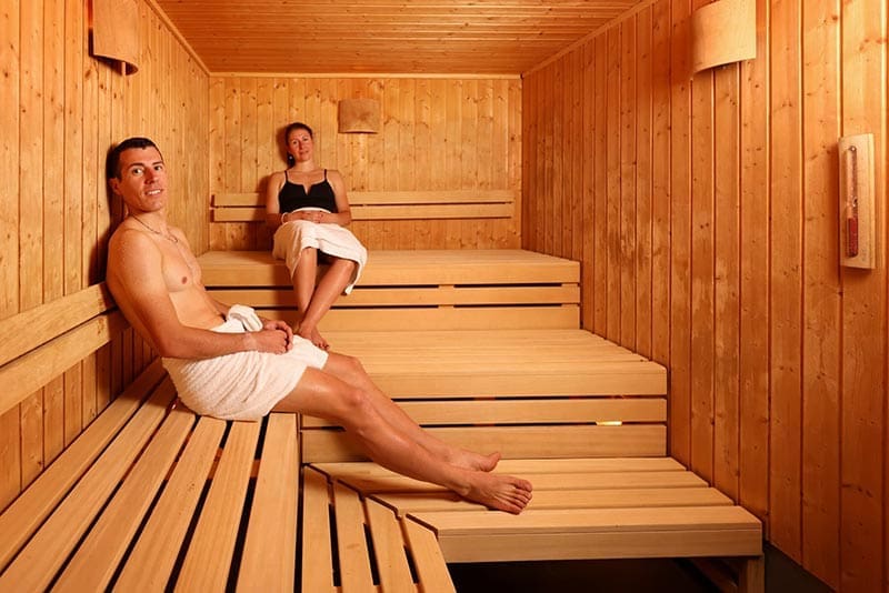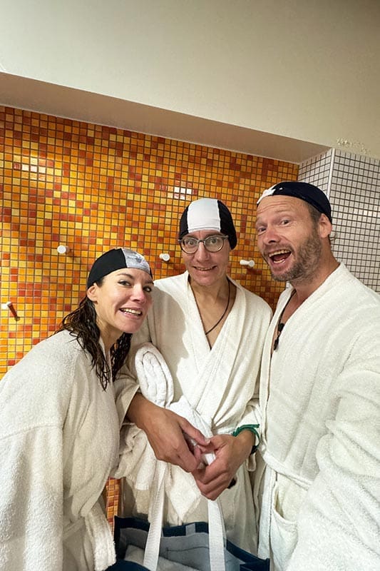 Nach dem salzigen Schweben geht’s dann in die Sauna. „Endlich Wärme!“, denken wir – und setzen uns hinein, als wären wir ausgehungerte Eidechsen, die zum ersten Mal seit Wochen wieder Sonne spüren.