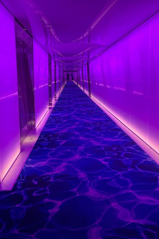 Unsere Admirals-Kabine war mehr als geräumig und mit viel Holz ausgestattet und da wir die Natur lieben, fühlten wir uns in der Natur-Atmosphäre so richtig wohl. Alles war sehr sauber und ordentlich gehalten. Sogar der Flur in Richtung des Hotelzimmers, erinnerte an eine Wasseroberfläche da der Teppich aus Wassermuster bestand. Mit einer bunten Beleuchtung war der Flur zum Beipspiel komplett in einer pinken Farbe eingetaucht worden. Dies seht ihr hier auf dem Bild ganz besonders schön. Wie wenn wir in einer Unterwasserwelt eingetaucht worden wären.